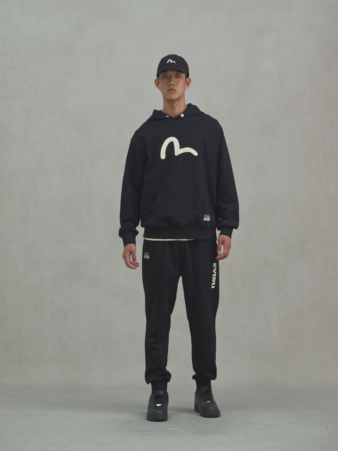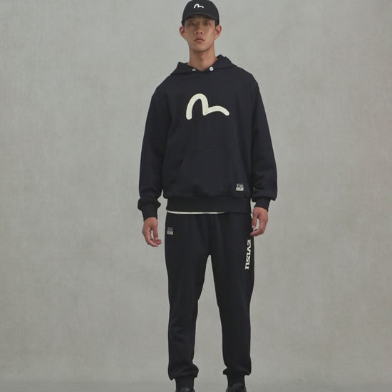 These sweatpants are themed around Grateful Crane, featuring elements like the Wheel of Wisdom, cranes, and mountains on the Daicock print on the back. With vibrant colors and a unique design, combined with the trademark embroidery on the front, they showcase the brand's subtle luxury style.
