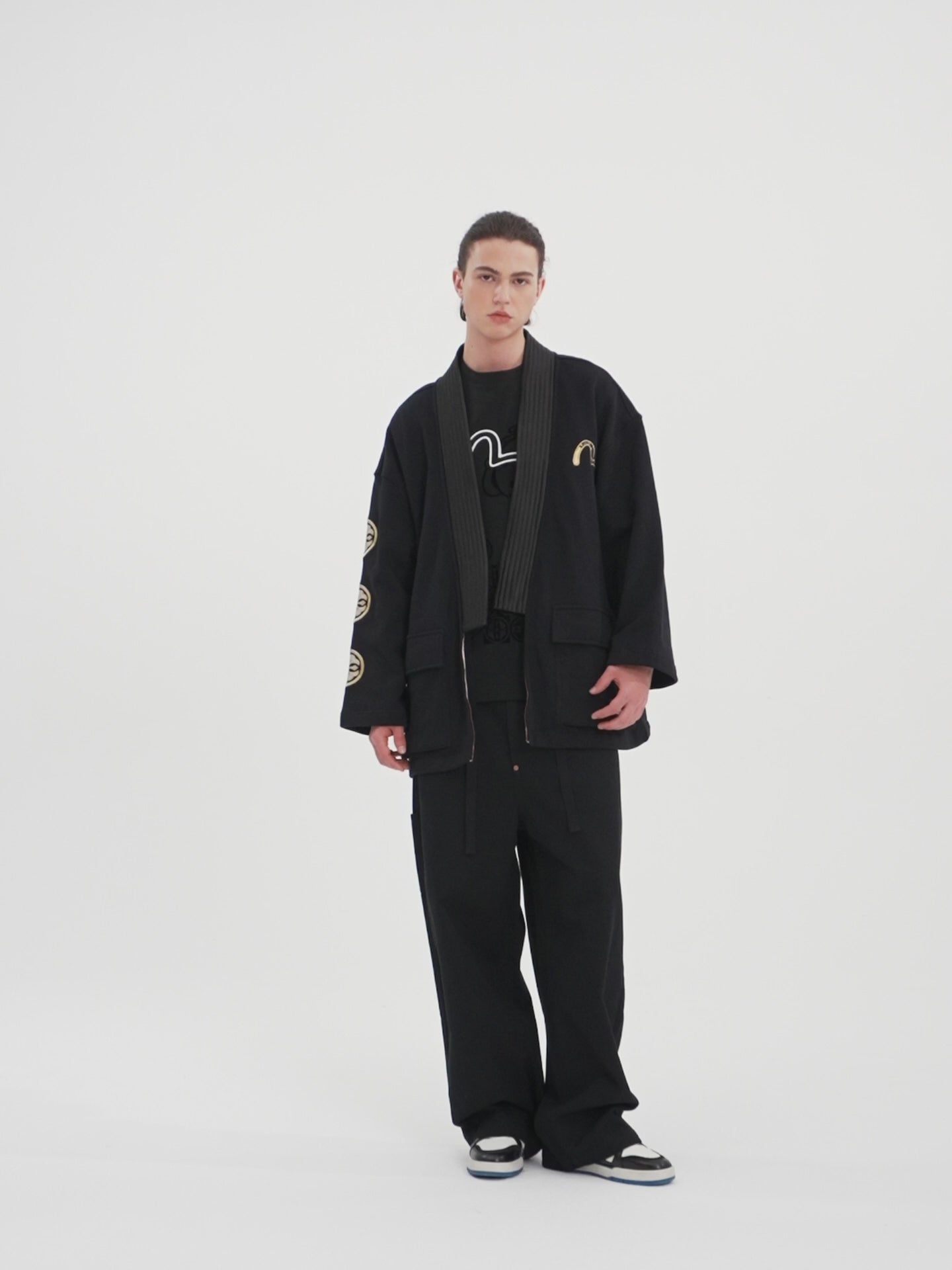 EVISU精美地刺绣了海鸥、商标和家花在这件和服外套的不同位置,搭配着后面的金鱼、海神、海浪和家花等丰富的印花图案,增添了层次感和细节。这个设计丰富多彩,展现了独特的风格和艺术感。